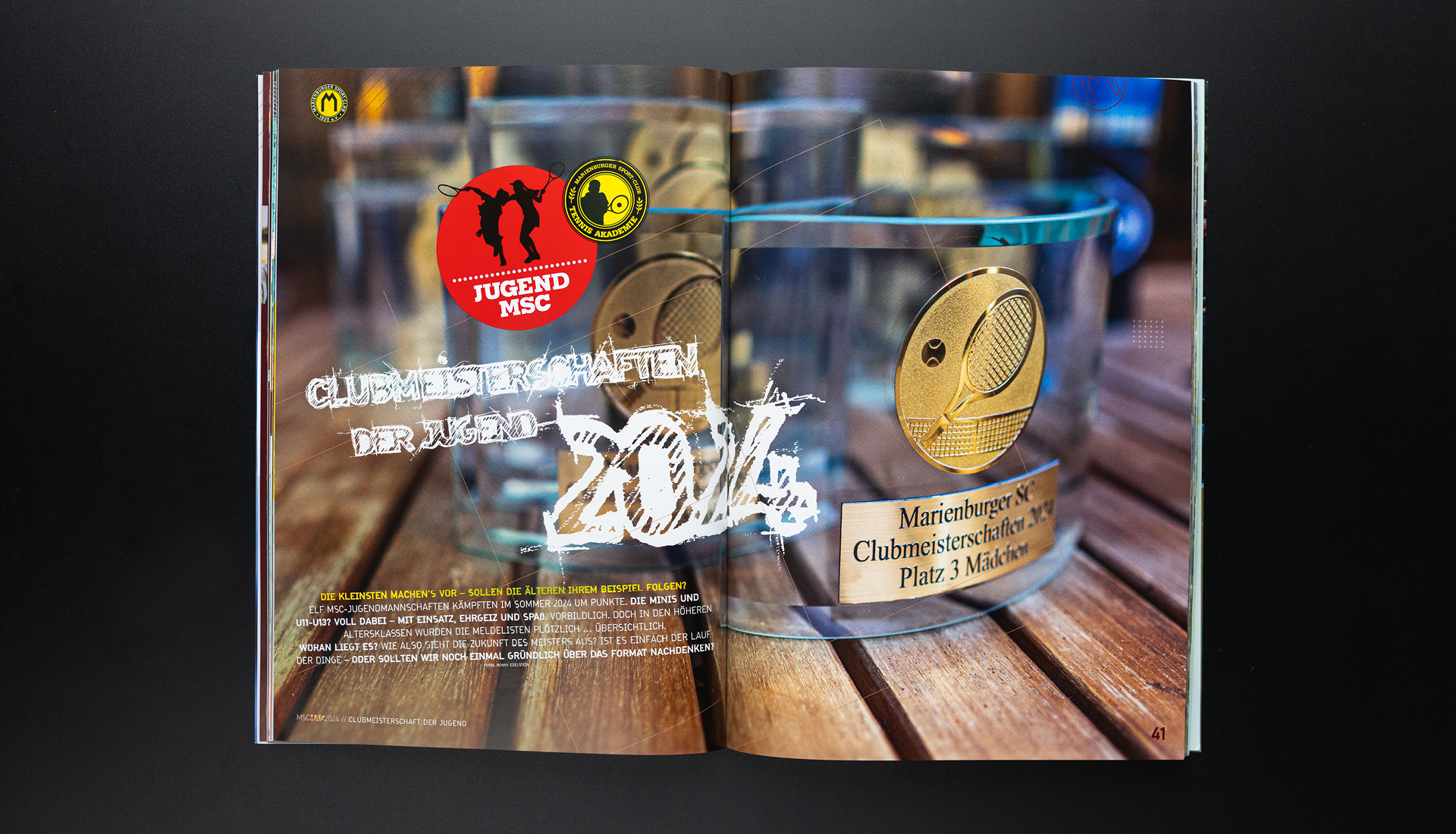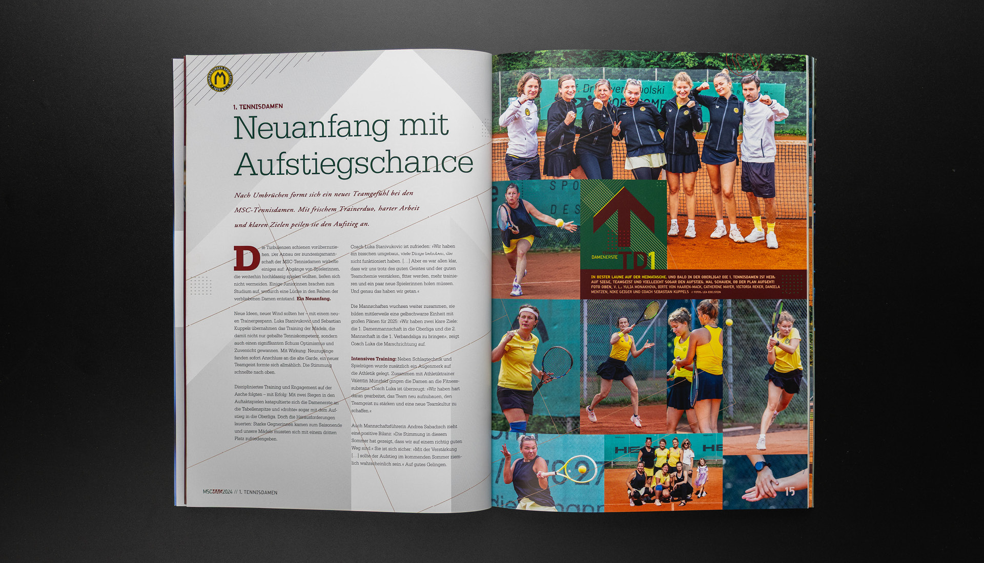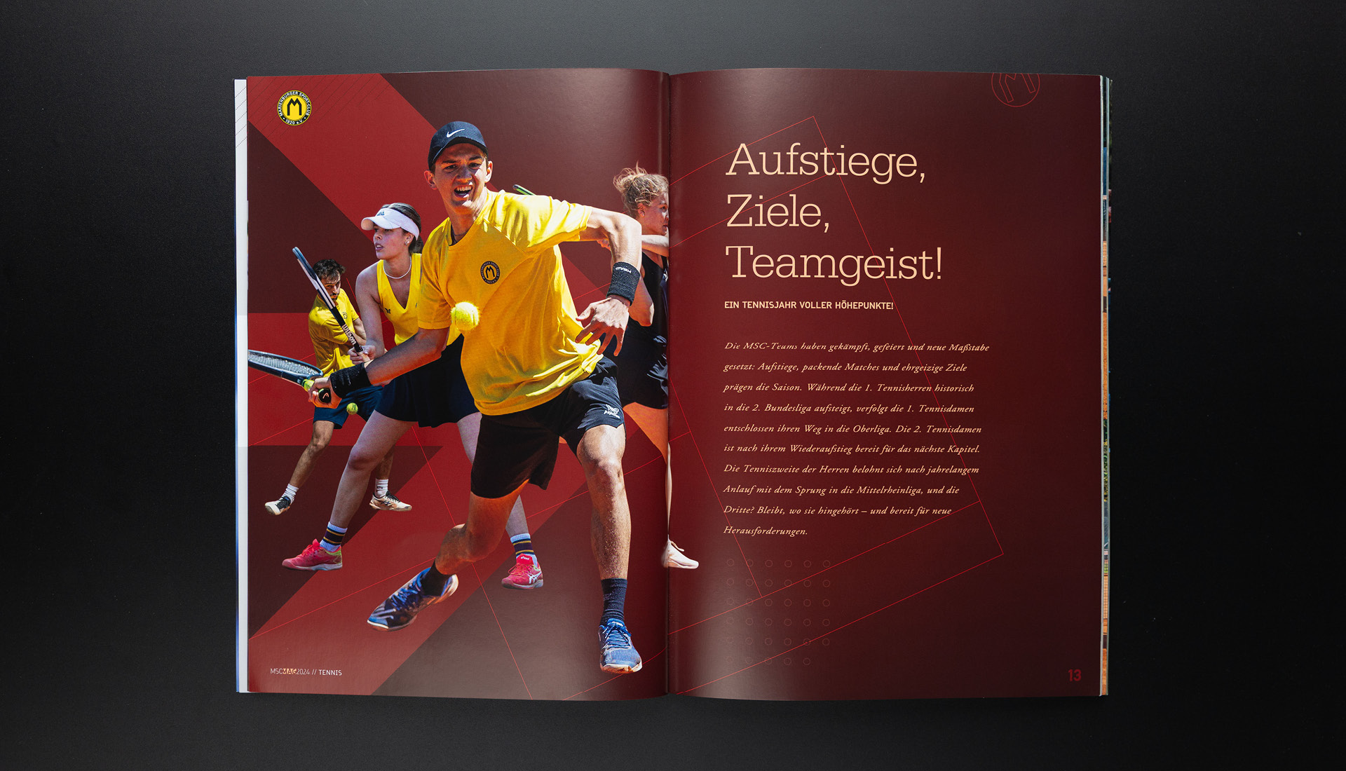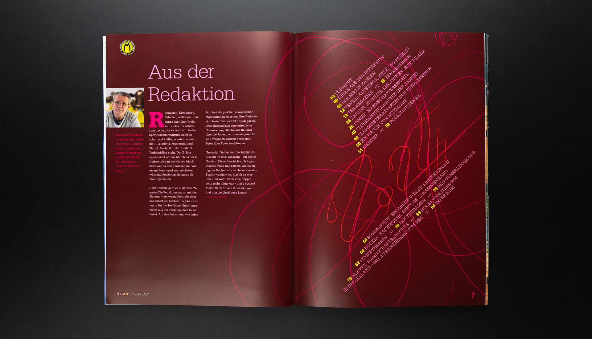 Mit der Jahresausgabe 2024 löste sich das MSC-Magazin erstmals spürbar von einer gestalterischen Tradition, die über Jahre nicht nur die Magazine geprägt, sondern sie zugleich zunehmend eingehegt hatte. Bereits 2023 hatten sich neue Farbakzente neben der gelb-schwarzen Duochromatik etabliert. 2024 wurde dieser Ansatz konsequent weitergeführt: Die Farbwelt trat in einen engeren Dialog mit den Bildwelten, suchte zusätzliche harmonische Ordnungsebenen und erweiterte damit das erzählerische Spektrum des Magazins.